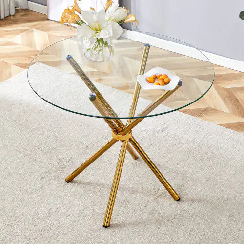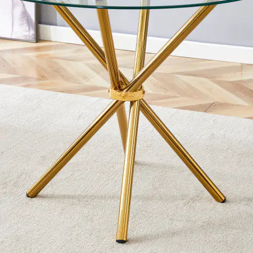 Round clear glass dining table with a unique shape for 4-6 people, ring-shaped gold metal legs, suitable for desks, kitchens, terraces, dining rooms.
